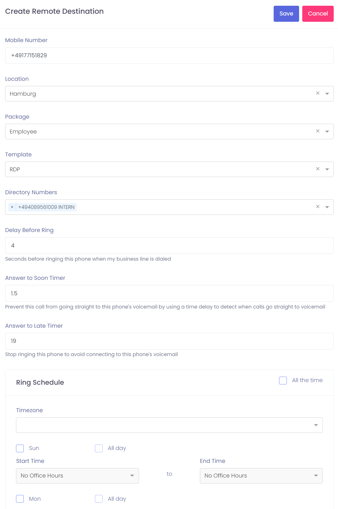 Auch wenn Sie eine andere Nummer verwenden möchten, löschen Sie einfach die vorausgefüllte Nummer und geben Sie die Nummer ein, die verwendet werden soll. Wenn alle Informationen in Ordnung sind, drücken Sie auf Speichern, um das Fernziel zu erstellen.