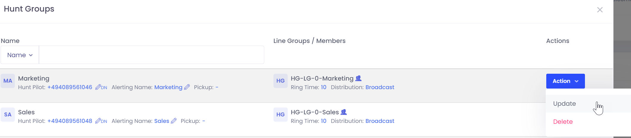 On the Hunt Group which you want to use click on “Action” -> “Update”