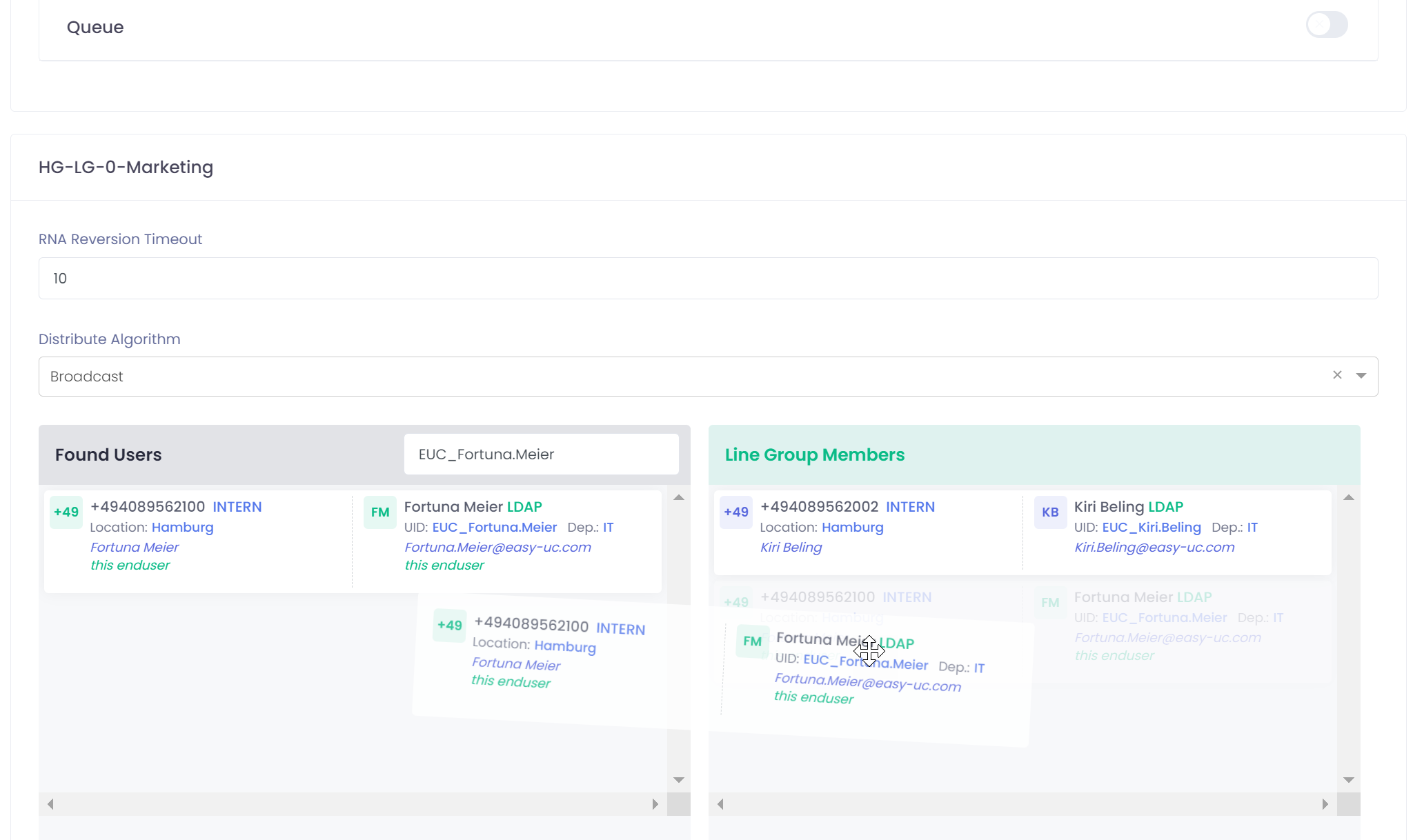 Now you get a list of all Hunt group settings. Scroll down to see the user list and drag and drop the username from left to right.