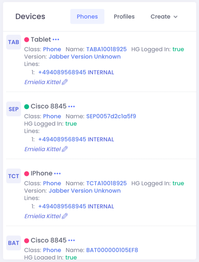 In the devices section you see all devices which was configured for the user. You can see the Registration Status of the device, green means the device is registered, red means its not registered.